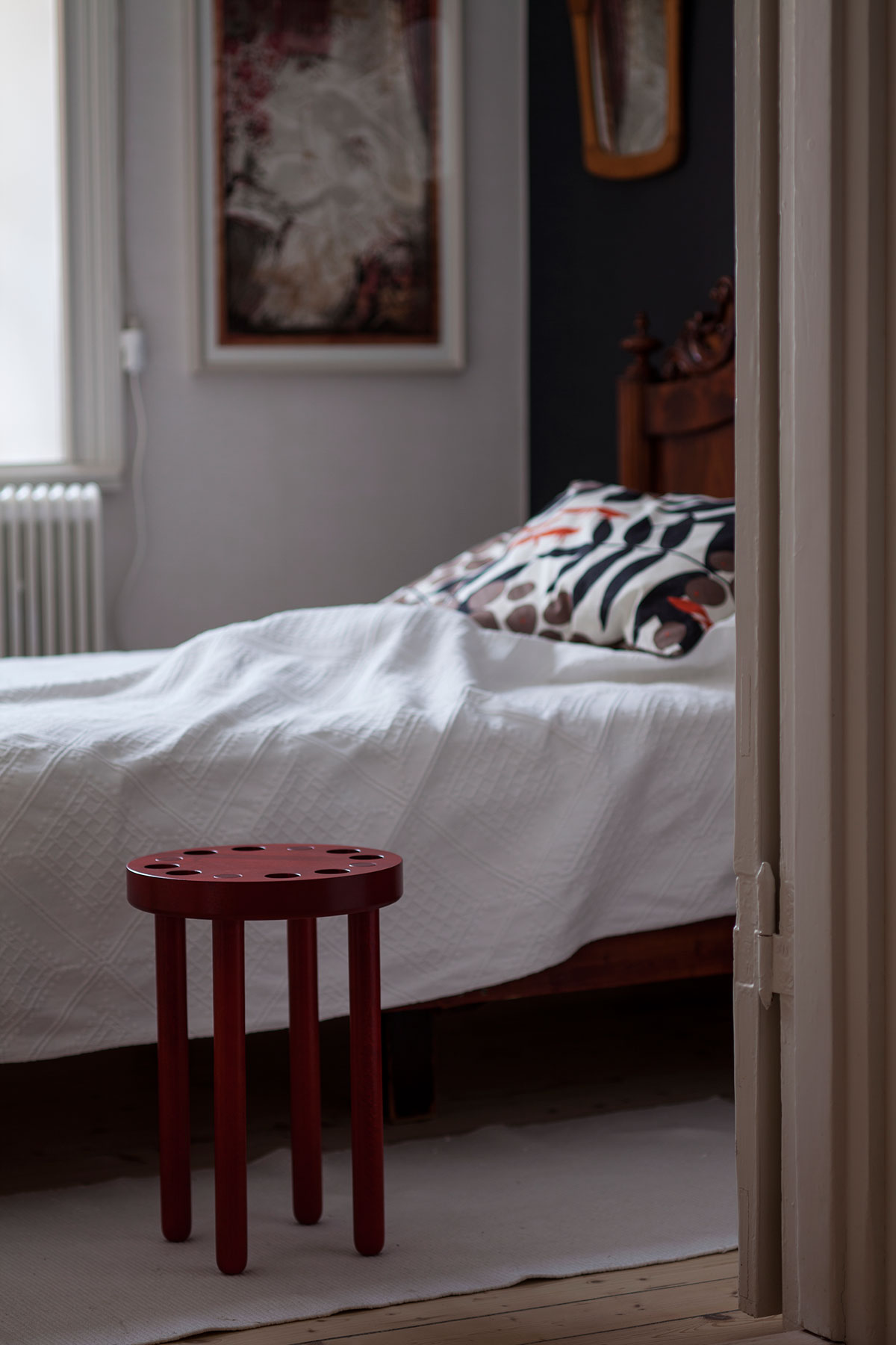 the inspiration was to develop furniture for adults but keep a spirit of child like play in the form and function. the stool is simple, bold and playful. the combination of four round legs and the eight holes in each seat create a stackable stool with a graphical approach. the stools poke one another to build up a stack, as the four legs pass through the holes of the other seat. the twist of each stool added creates a rhythm as the stack grows higher. the addition of the fourth stool establishes a new layer with a different tempo. the composition of different colours and variations to the rhythm lead us create our own structure, like a geometric sculpture. the poke is made in finnish natural birch and oak. the stool is finished with a hard wearing lacquer to create a solid and smooth surface to make stacking and unstacking work effortlessly.